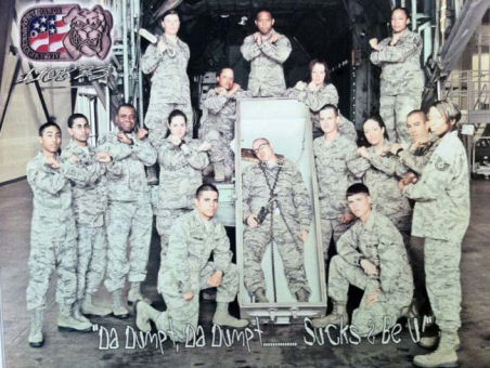 An accompanying caption to the photo, “Da Dumpt, Da Dumpt…Sucks 2 Be U,” refers to the sound a cargo pallet makes when it is transferred onto an aircraft, wing spokesman Gerry Proctor said.