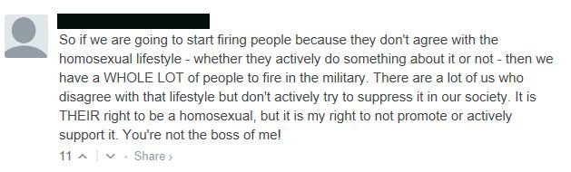 “If we are going to start firing people because they don’t agree with the homosexual lifestyle — whether they actively do something about it or not — then we have a WHOLE LOT of people to fire in the military. There are a lot of us who disagree with that lifestyle…It is THEIR right to be a homosexual, but it is my right to not promote or actively support it…”